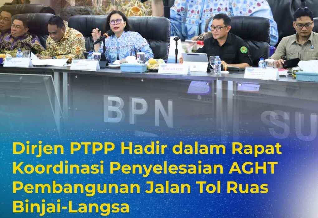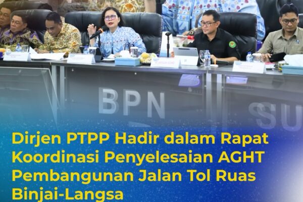 Direktorat Jenderal Pengadaan Tanah dan Pengembangan Pertanahan (Ditjen PTPP) Kementerian ATR/BPN yang dipimpin oleh Direktur Jenderal PTPP, Embun Sari, menghadiri Rapat Koordinasi Penyelesaian Administrasi dan Hukum Tanah (AGHT) pembangunan Jalan Tol Trans Sumatera Ruas Binjai–Langsa