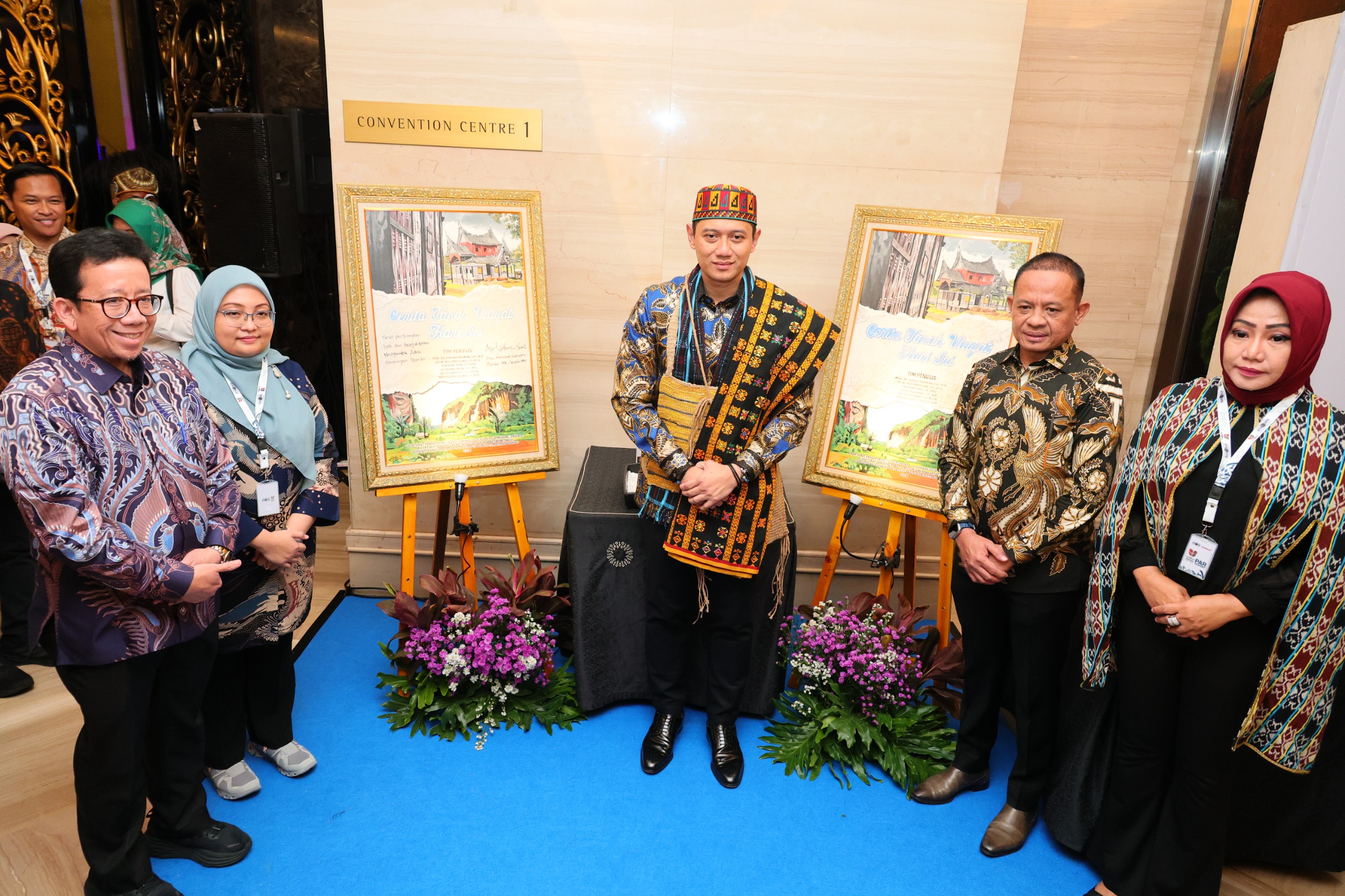 Bandung – Menteri Agraria dan Tata Ruang/Kepala Badan Pertanahan Nasional (ATR/BPN), Agus Harimurti Yudhoyono (AHY) menandatangani lukisan yang merupakan cover atau Sampul dari Buku “Cerita Tanah Ulayat Hari Ini” pada Rabu (04/09/2024) di The Trans Luxury Hotel, Bandung.