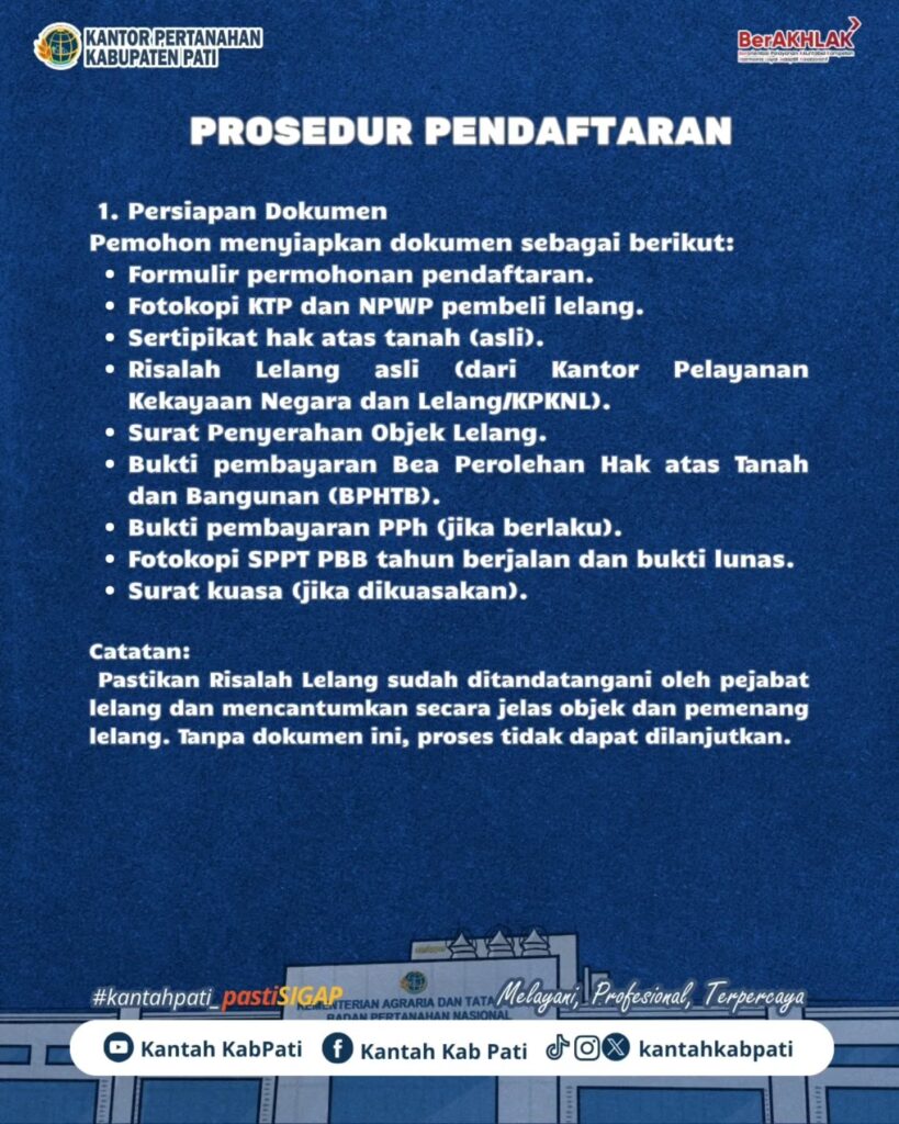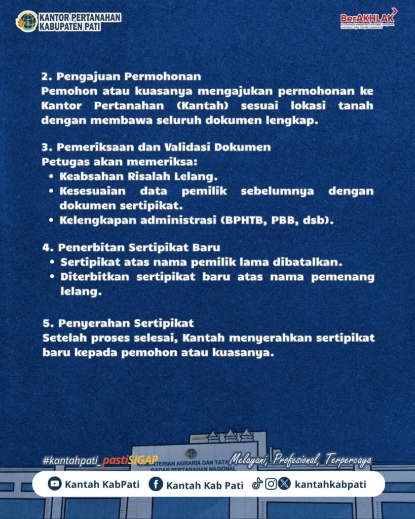 Halo #SobATRBPN, ayo segera ajukan pengurusan sertipikat lelang melalui Kantor Pertanahan (BPN). Dengan prosedur yang jelas dan transparan, BPN siap membantu memastikan hak Anda tercatat secara sah dan aman sesuai ketentuan peraturan perundang-undangan.