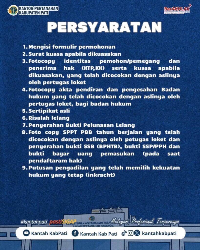 Untuk informasi lebih lanjut, silakan datang ke loket pelayanan Kantor Pertanahan setempat atau kunjungi laman resmi Kementerian ATR/BPN.