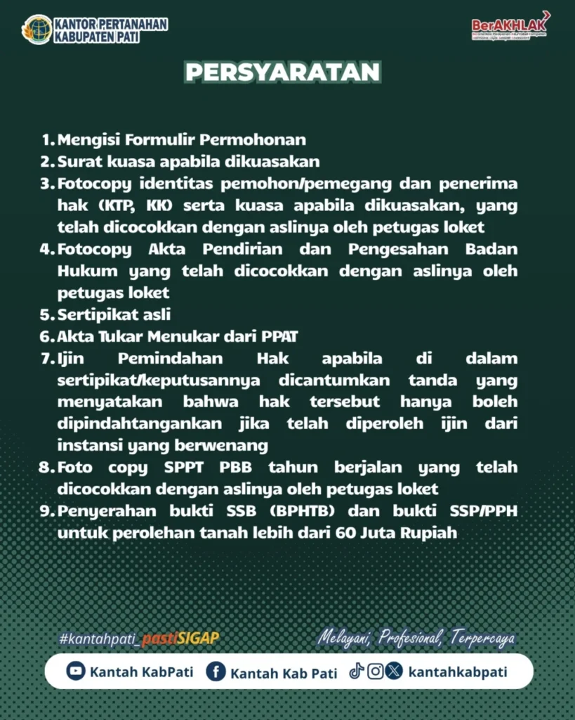 Setiap warga yang melakukan tukar menukar tanah wajib mengurus perubahan data sertipikat melalui kami, Kantor Pertanahan Kabupaten Pati. Kami siap melayani dan memastikan proses berjalan sesuai ketentuan.