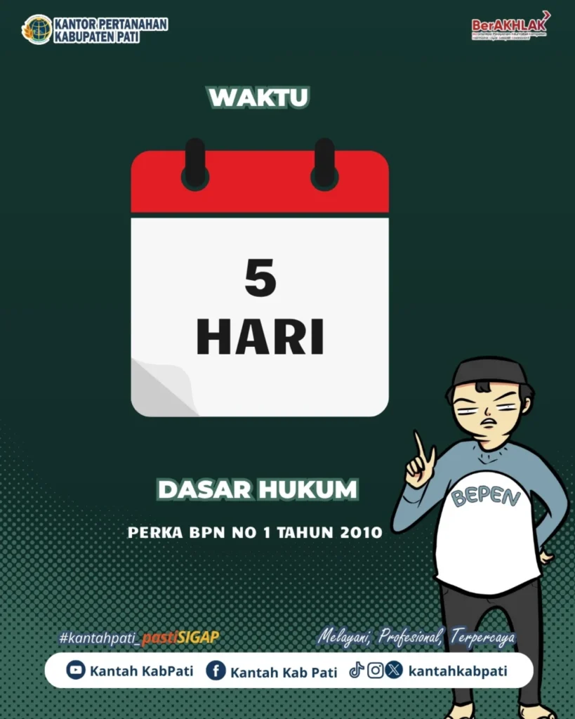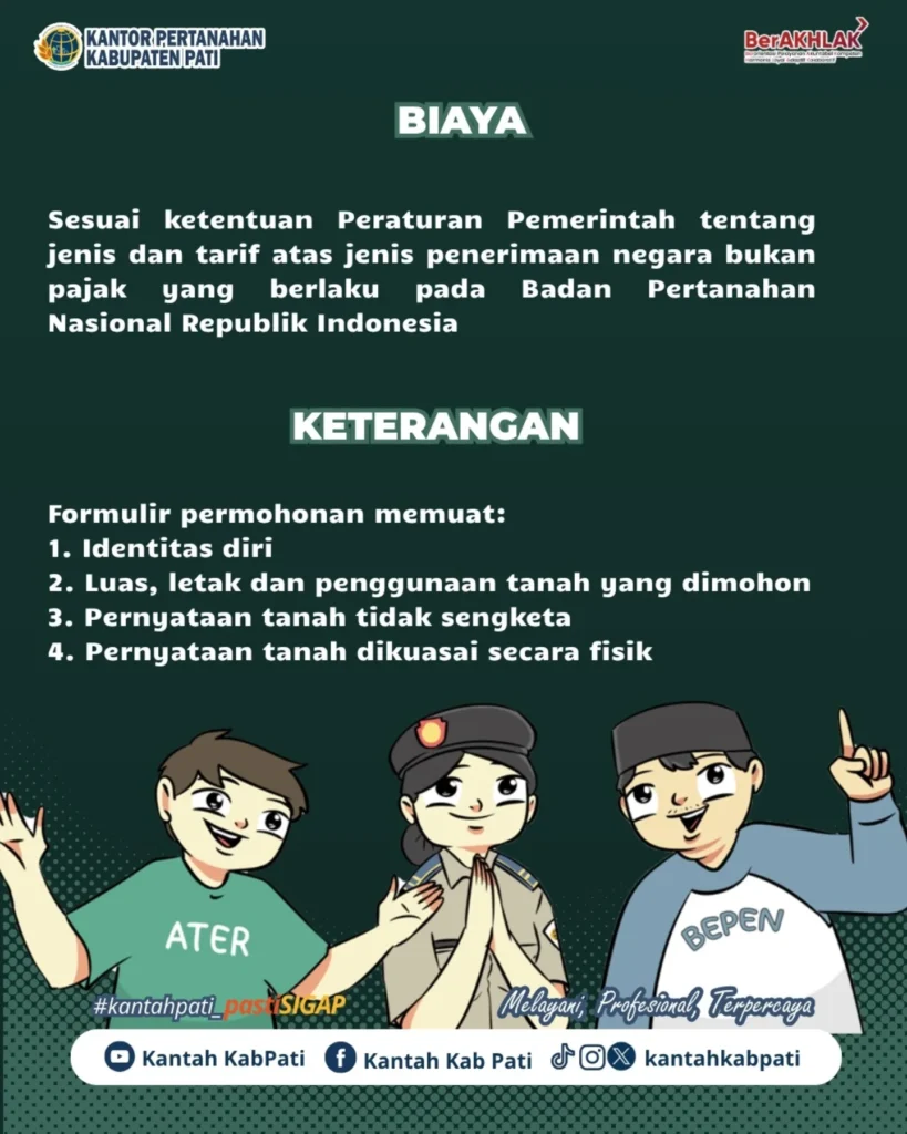 Pengurusan dilakukan di loket pelayanan Kantor Pertanahan Kabupaten Pati. Untuk kemudahan, masyarakat juga bisa memantau proses berkas melalui aplikasi “Sentuh Tanahku”.