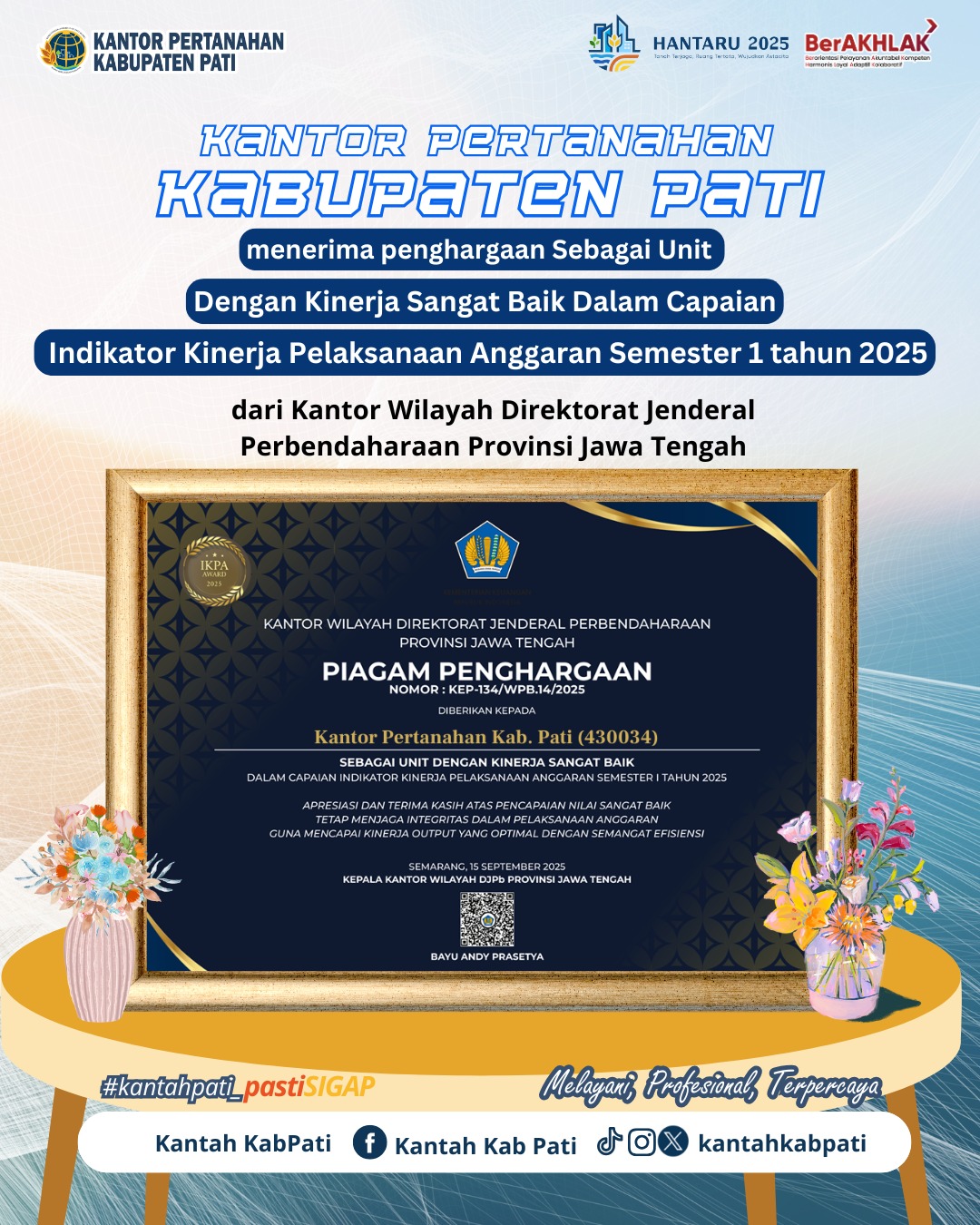 Kantor Pertanahan Kabupaten Pati menerima penghargaan sebagai Unit dengan Kinerja Sangat Baik dalam Capaian Indikator Kinerja Pelaksanaan Anggaran Semester I Tahun 2025 dari Kantor Wilayah Direktorat Jenderal Perbendaharaan Provinsi Jawa Tengah.