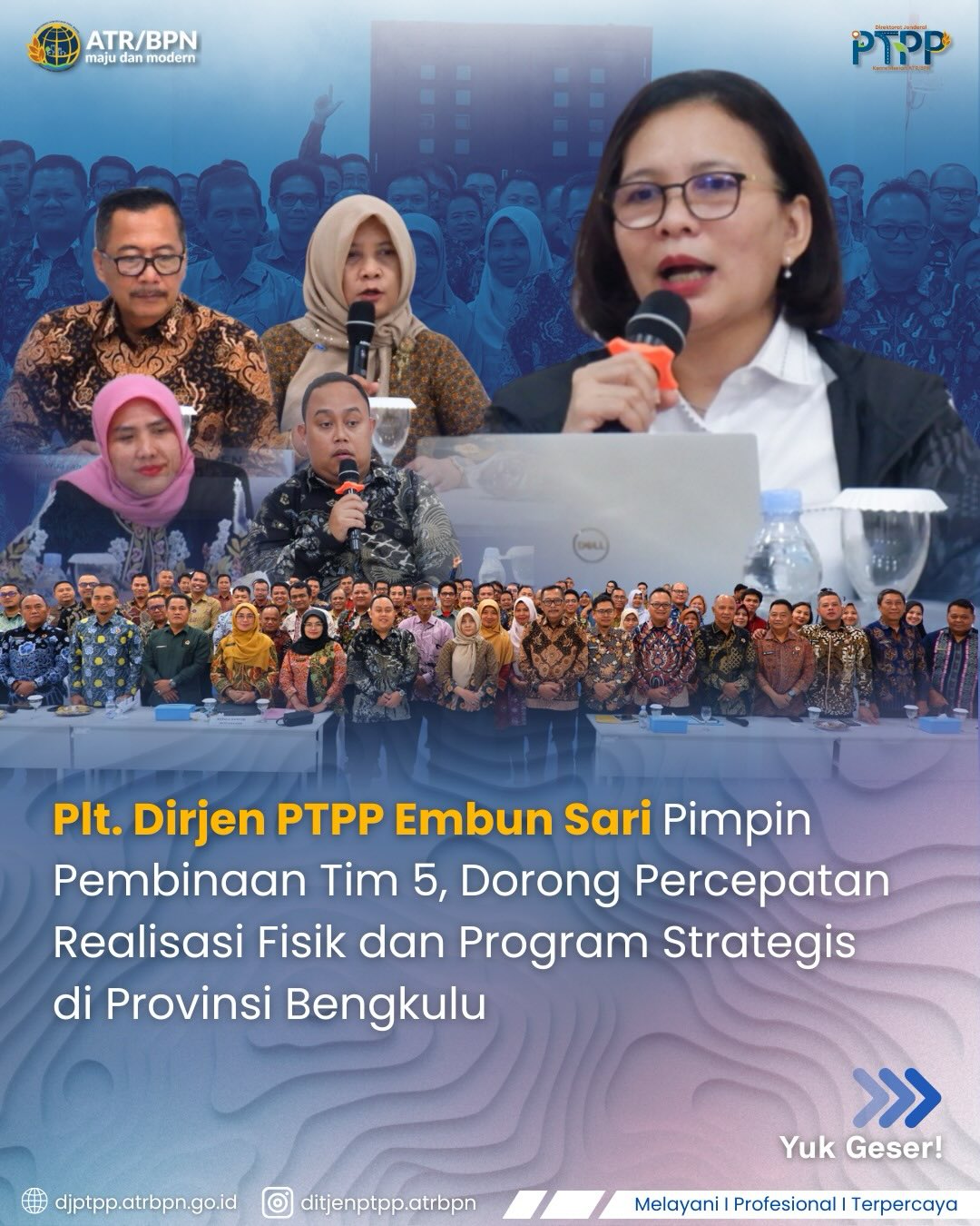 Bengkulu – Direktorat Jenderal Pengadaan Tanah dan Pengembangan Pertanahan (Ditjen PTPP), Kementerian ATR/BPN, menggelar acara Pembinaan Pelaksanaan Tugas dan Fungsi Kantor Wilayah BPN dan Kantor Pertanahan Tahun 2025. Acara ini dipimpin oleh Pejabat Pembina Tim 5, dengan Plt. Direktur Jenderal PTPP Embun Sari selaku Koordinator. Kegiatan pembinaan ini dilaksanakan di Provinsi Bengkulu pada Kamis-Jumat (20-21/11), bertempat di Aula, Kantor Wilayah BPN Provinsi Bengkulu.