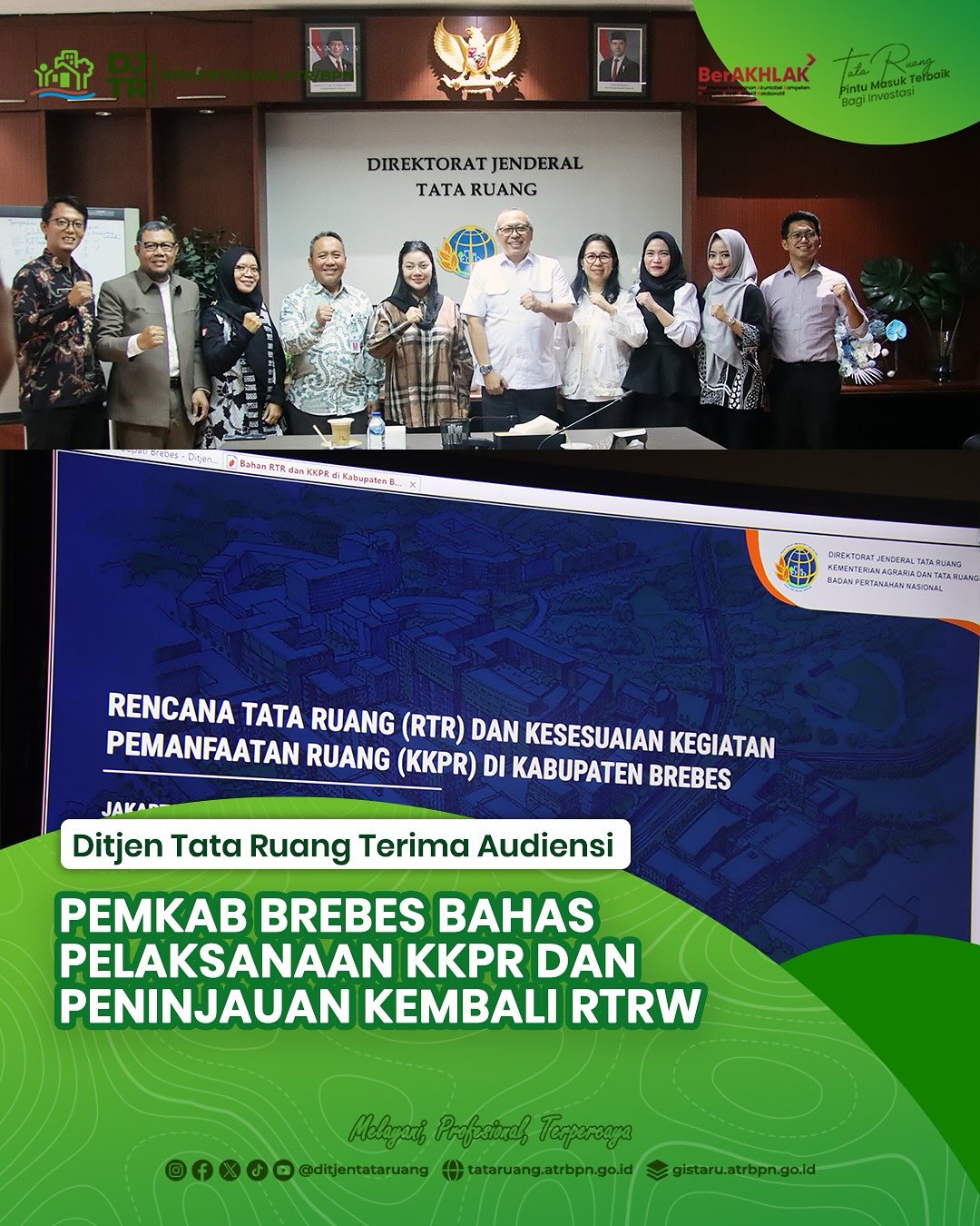 Jakarta – Direktorat Jenderal Tata Ruang Kementerian ATR/BPN menerima kunjungan Pemkab Brebes dalam rangka audiensi pembahasan pelaksanaan KKPR untuk kegiatan berusaha, nonberusaha, dan strategis nasional di Kabupaten Brebes. Audiensi berlangsung di Ruang Rapat Bromo, Gedung Direktorat Jenderal Tata Ruang pada Selasa (03/02/2026).
